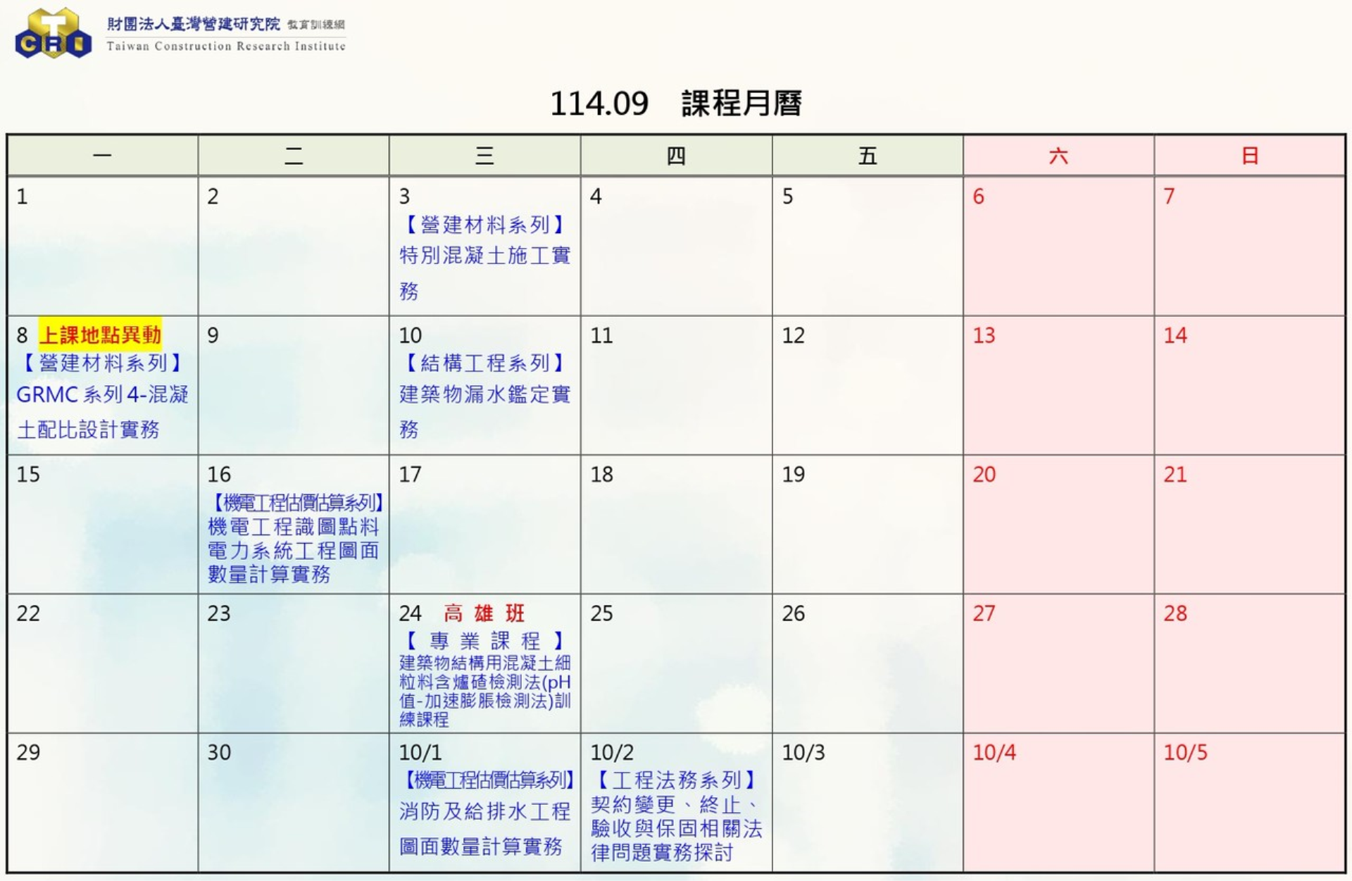 臺灣營建研究院教育訓練相關培訓課程2025.09月曆如下圖